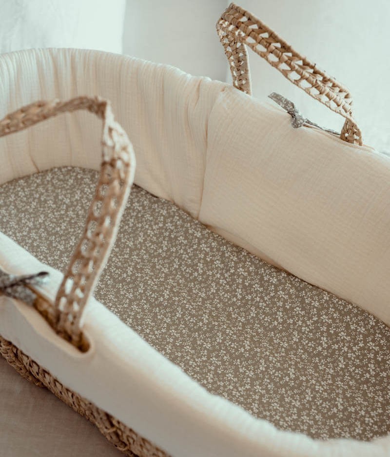 Nuestra cesta moisés perfecta incluye: la cesta cesta hecha de hojas de palma naturales. el colchón iluminado P’tit. el apósito de la cesta moisés en gasa doble de algodón sin blanquear relleno de guata hipoalergénica y sujetado por pequeñas ataduras. y la sábana bajera ajustable de algodón verde con motivos florales muy suaves. Algodones con certificación OEKO TEX Peso máximo del niño: 9 kg +